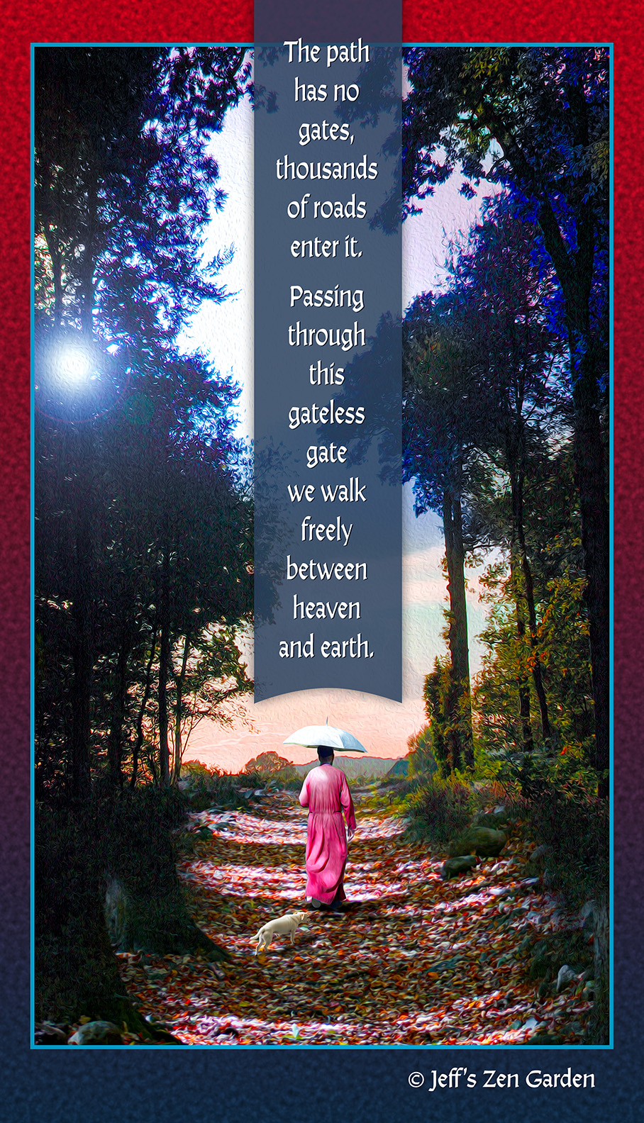 The Gateless Path Leave a reply The path has no gates, thousands of roads enter it. Passing through this gateless gate, we walk freely between heaven and earth. Share this: Share on X (Opens in new window) X More Email a link to a friend (Opens in new window) Email Share on Facebook (Opens in new window) Facebook Like Loading... Related