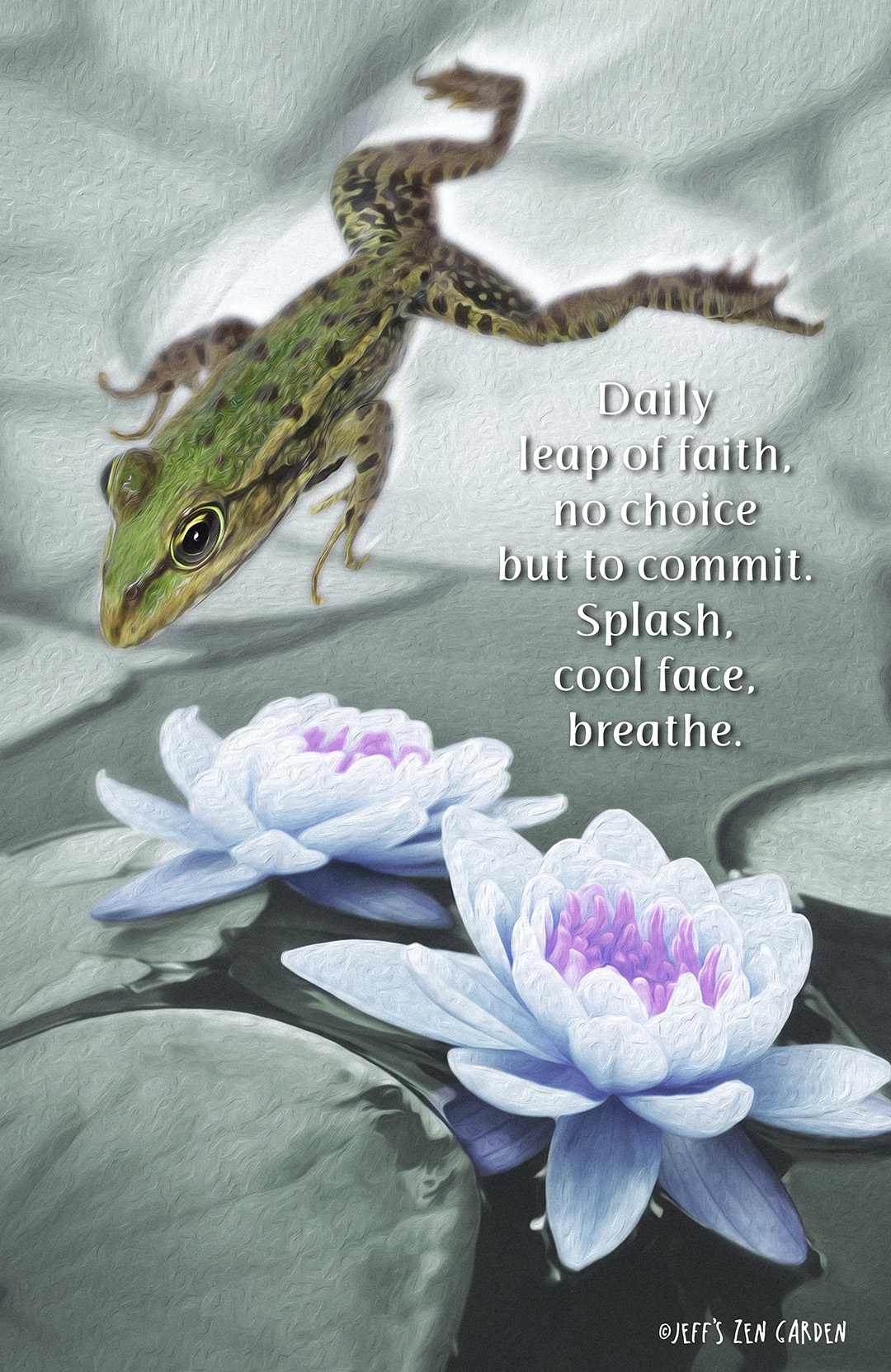 Daily Leap of Faith Leave a reply Daily leap of faith, no choice but to commit. Splash, cool face, breathe.